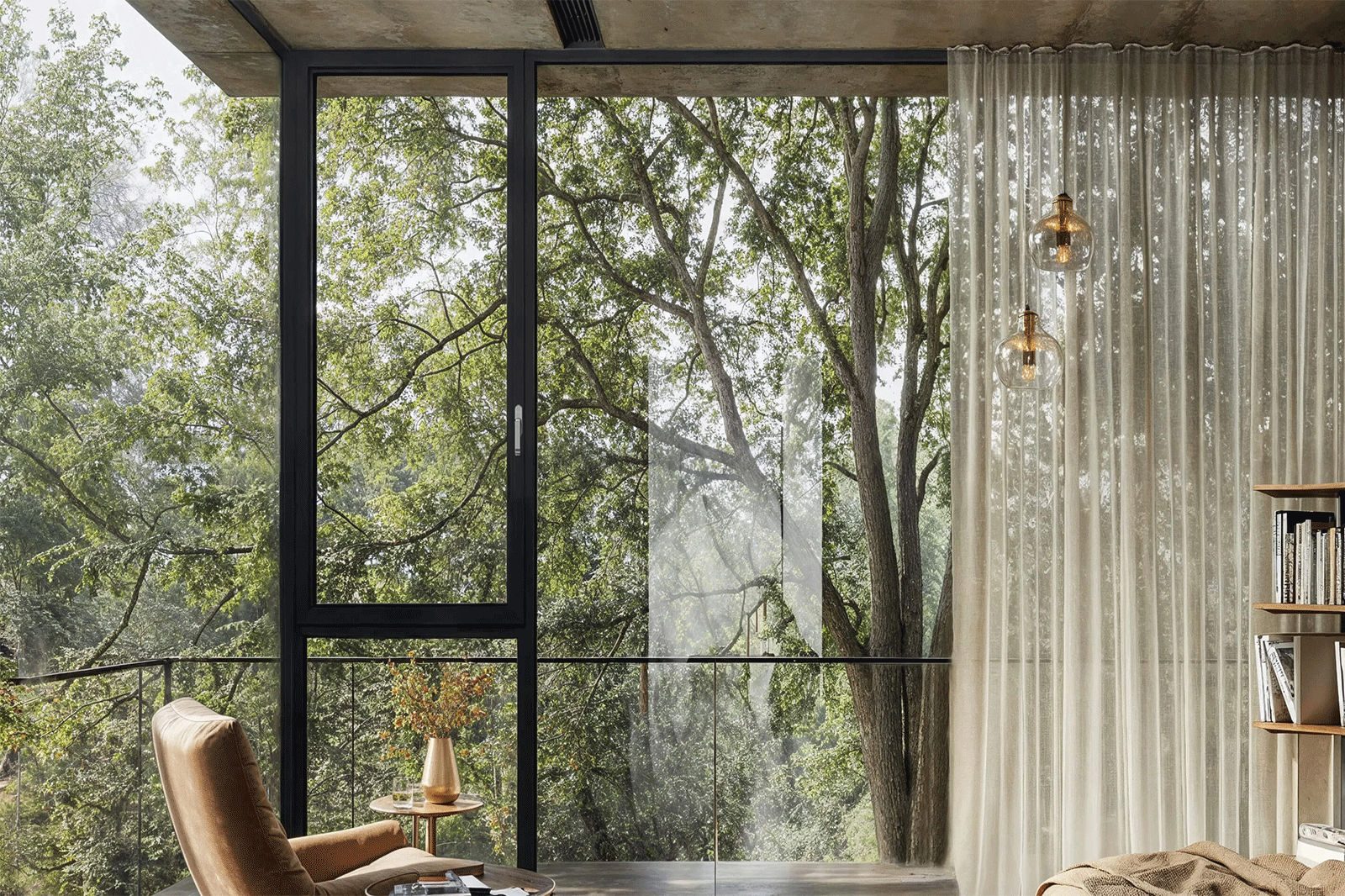 框扇室內(nèi)外平齊設(shè)計(jì),線條簡(jiǎn)約利落,立面效果簡(jiǎn)潔平整。窗扇開啟狀態(tài),開啟扇與建筑外立面平行。